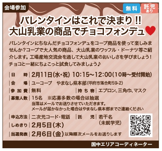 バレンタインにちなんだチョコフォンデュをコープ商品を使って楽しみませんか?